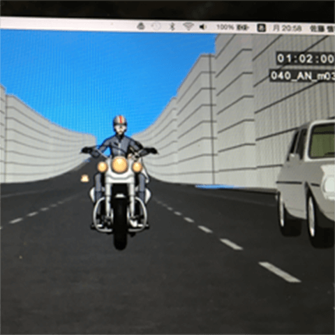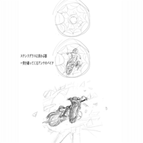 監督自身がそれほど絵心がない為、ハーレーのミニカーやデッサン人形などを買い込み、物凄く苦労して(笑)描かれた後、これをベースに演出の方が各カットの尺を決め込んだ絵コンテを作成、といった作業行程になりました。