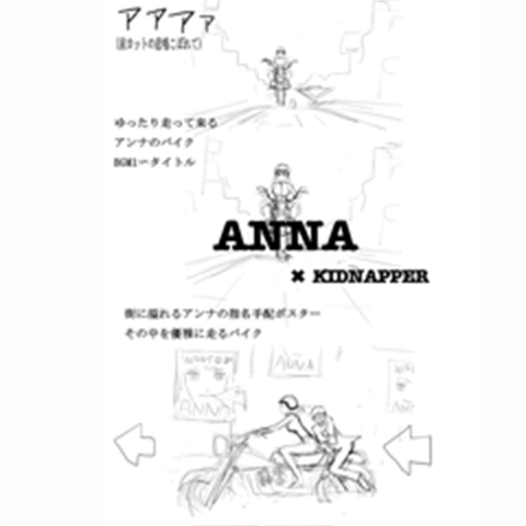 「誘拐アンナ」はオリジナル作品ですが、同時に往年の映画群へのオマージュでも構成されています。なので作中の細いイメージ、例えばこのカットやシーンはあの映画っぽく、とかここはオリジナルの構成で、等々はは全て脚本を書いた監督の頭の中にしかありません。そこで監督自身が描いて示す必要が出てきました。絵コンテ以前のイメージボード、と呼ぶべきでしょうか。 監督自身がそれほど絵心がない為、ハーレーのミニカーやデッサン人形などを買い込み、物凄く苦労して(笑)描かれた後、これをベースに演出の方が各カットの尺を決め込んだ絵コンテを作成、といった作業行程になりました。